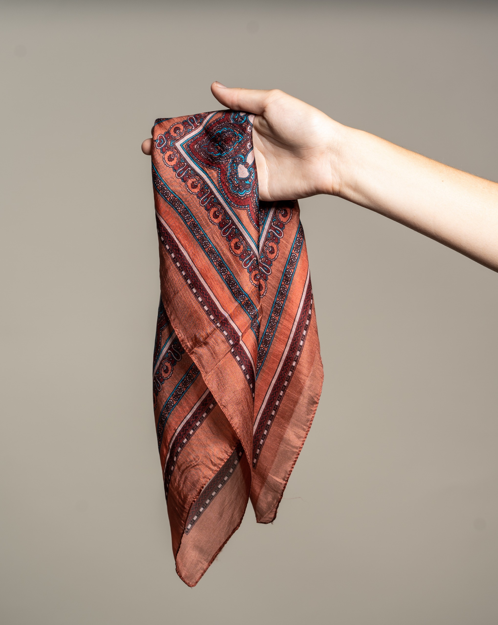 Der Look wirkt besonders gelungen, wenn sich die Farbe des Lippenstifts im Muster des Tuches wiederfindet.